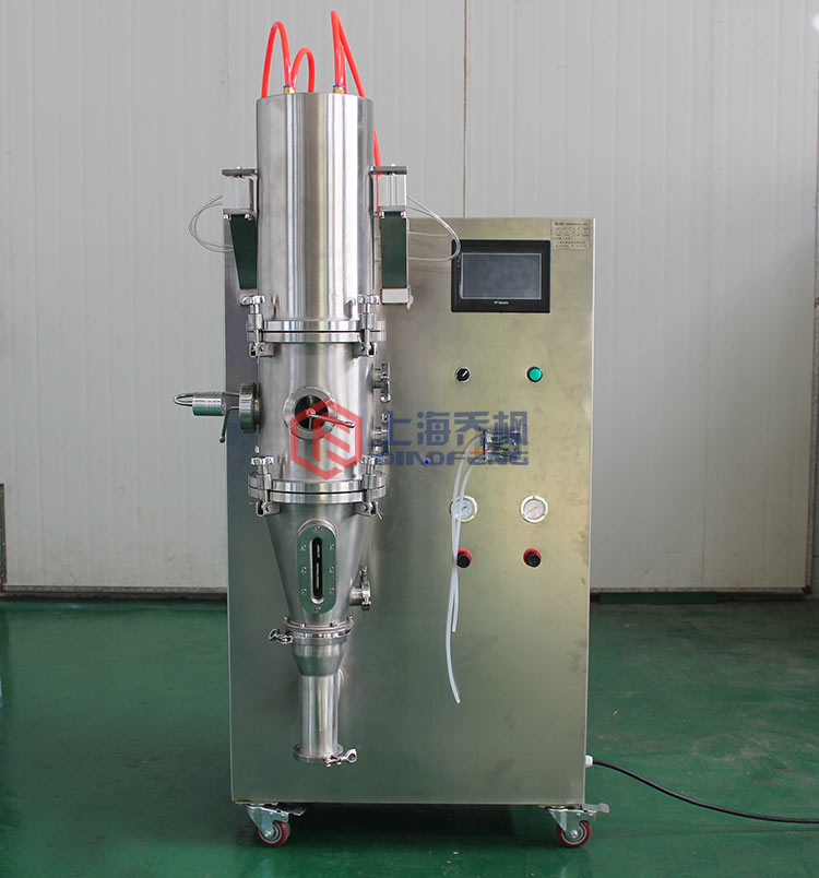 粉狀物料投入料斗密閉容器內,由于熱氣流的作用,使粉末懸浮呈流化狀循環流動,達到均勻混合,同時噴入霧狀粘結劑潤濕容器內的粉末,使粉末凝成疏松的小顆粒,成粒的同時,由于熱氣流對其作高效干燥,水份不斷蒸發,粉末不斷凝固,引過程重復進行,形成理想的,均勻的多微孔球狀顆粒,在容器中一次完成混合,造粒,干燥三個工序。
